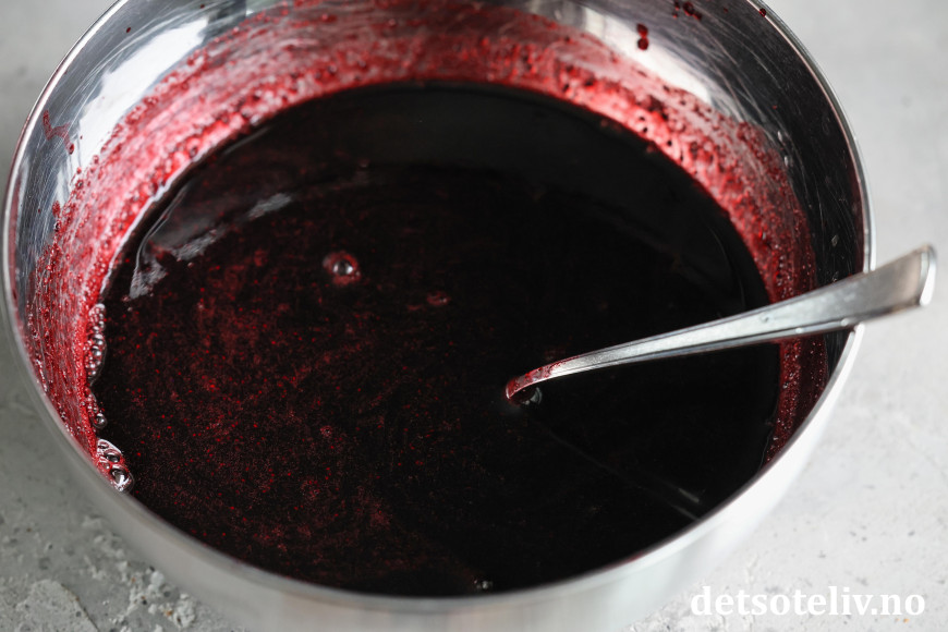 Sil blåbærsausen over i en bolle. Press godt med baksiden av en skje slik at du får med all den gode blåbærsaften.