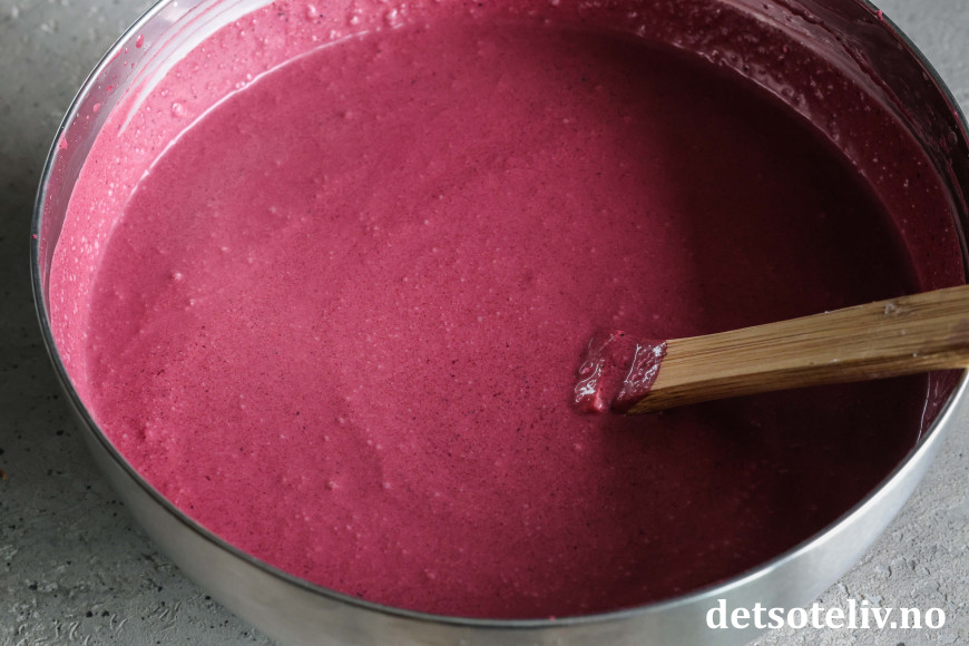 Bland den kalde blåbærsaften inn i kremen, litt om gangen. Pisk med en ballongvisp slik at du får en krem med jevn, blålilla farge.