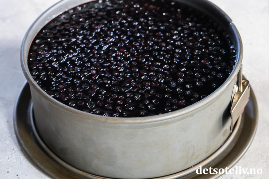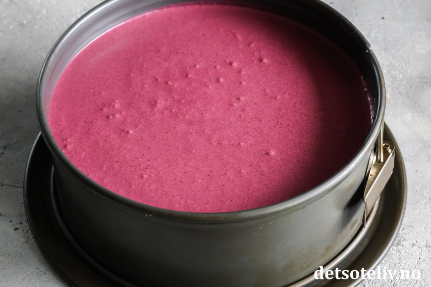 Ta kaken ut av kjøleskapet. Hell blandingen over blåbærfromasjen. Sett kaken tilbake i kjøleskapet i minst 5 timer, slik at blåbærgeléen stivner helt.
