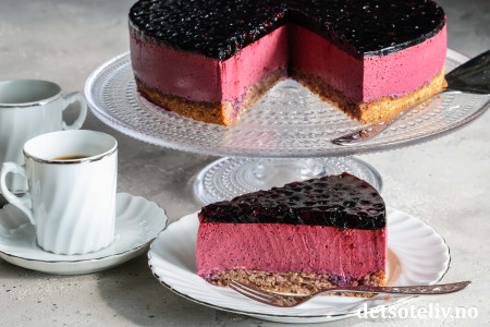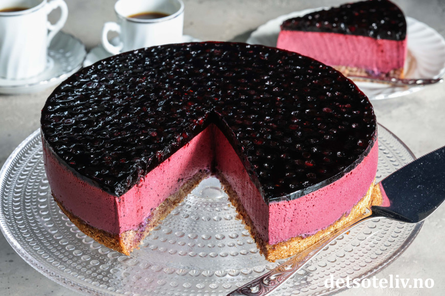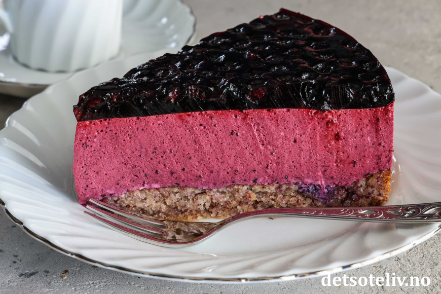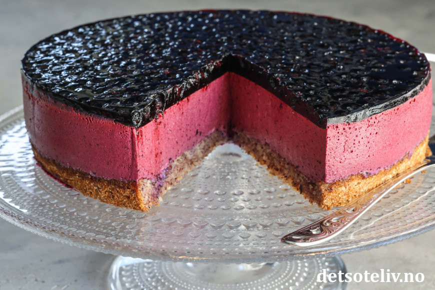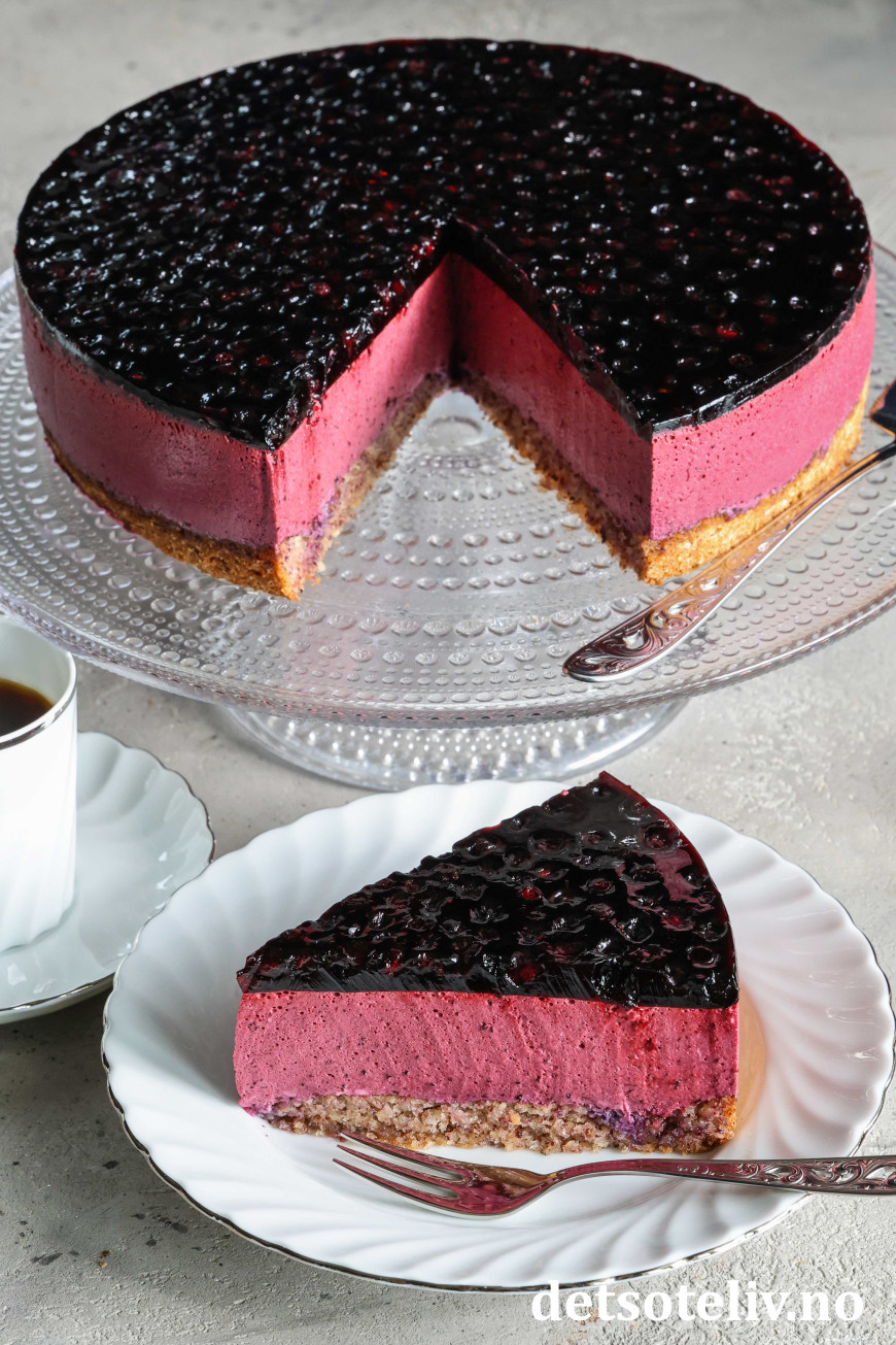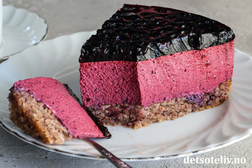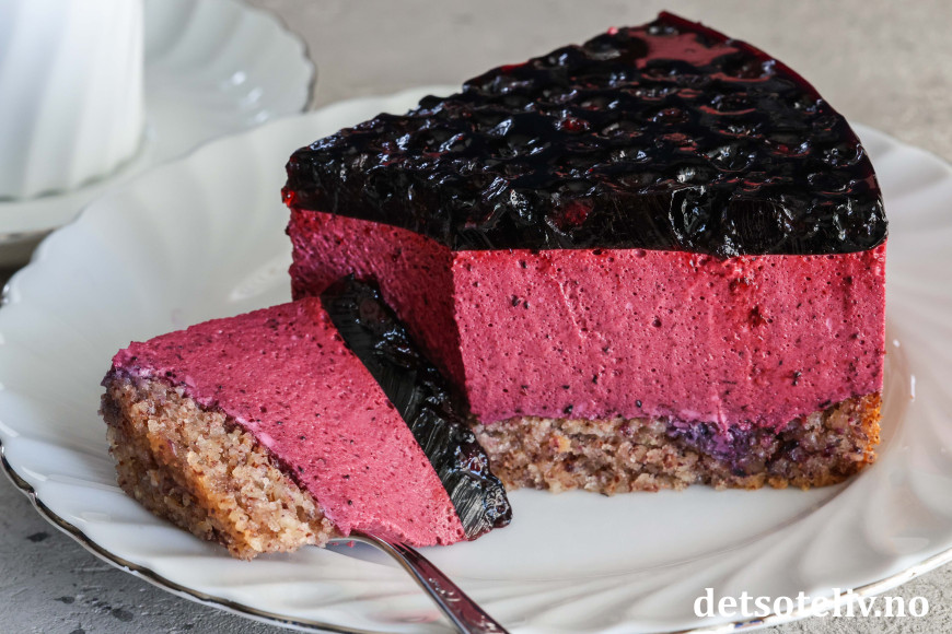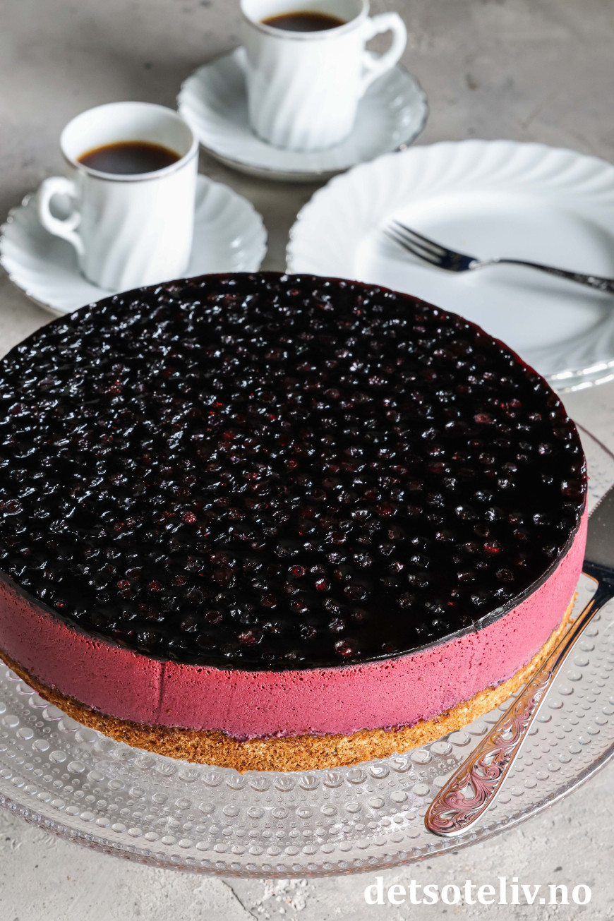 En myk nøttekakebunn dekkes med et tykt lag blålilla blåbærfromasj som smelter på tungen.