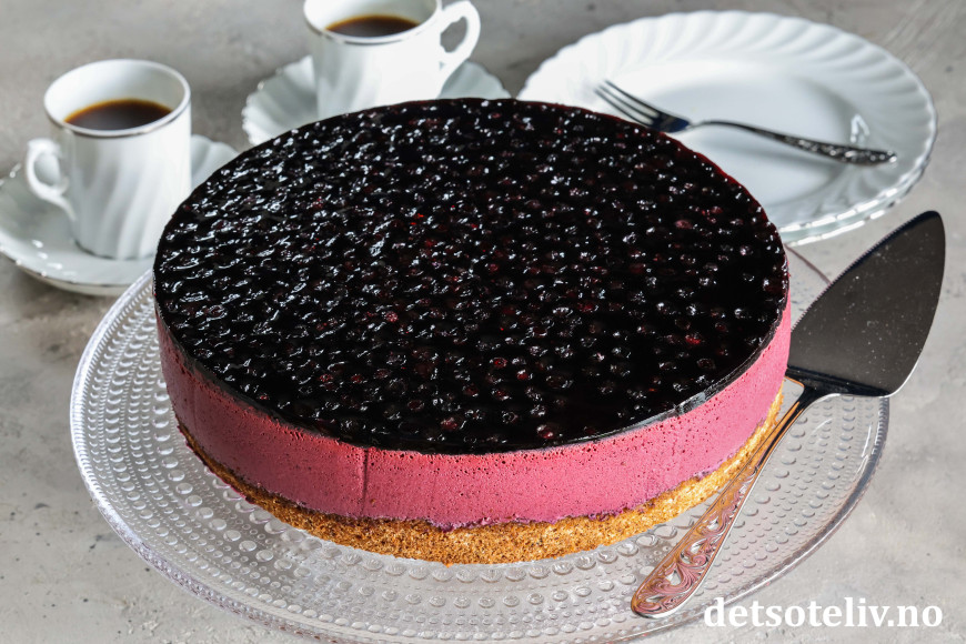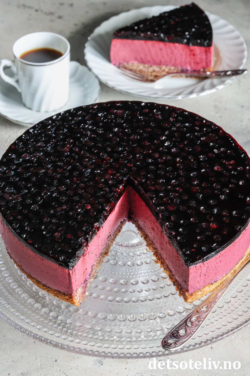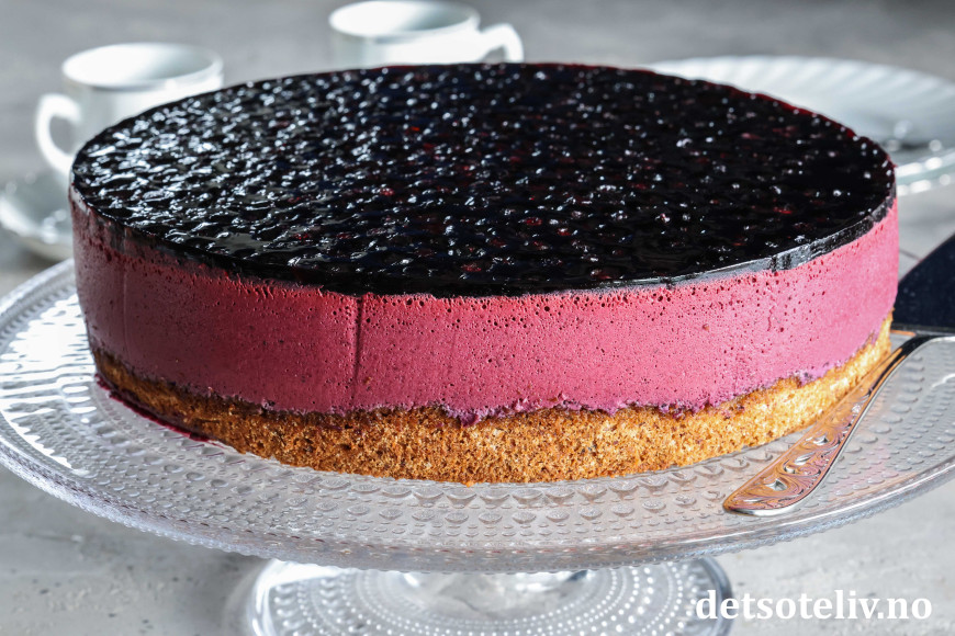 På toppen av kaken et mørkeblått lag blåbær i blåbærgelé.