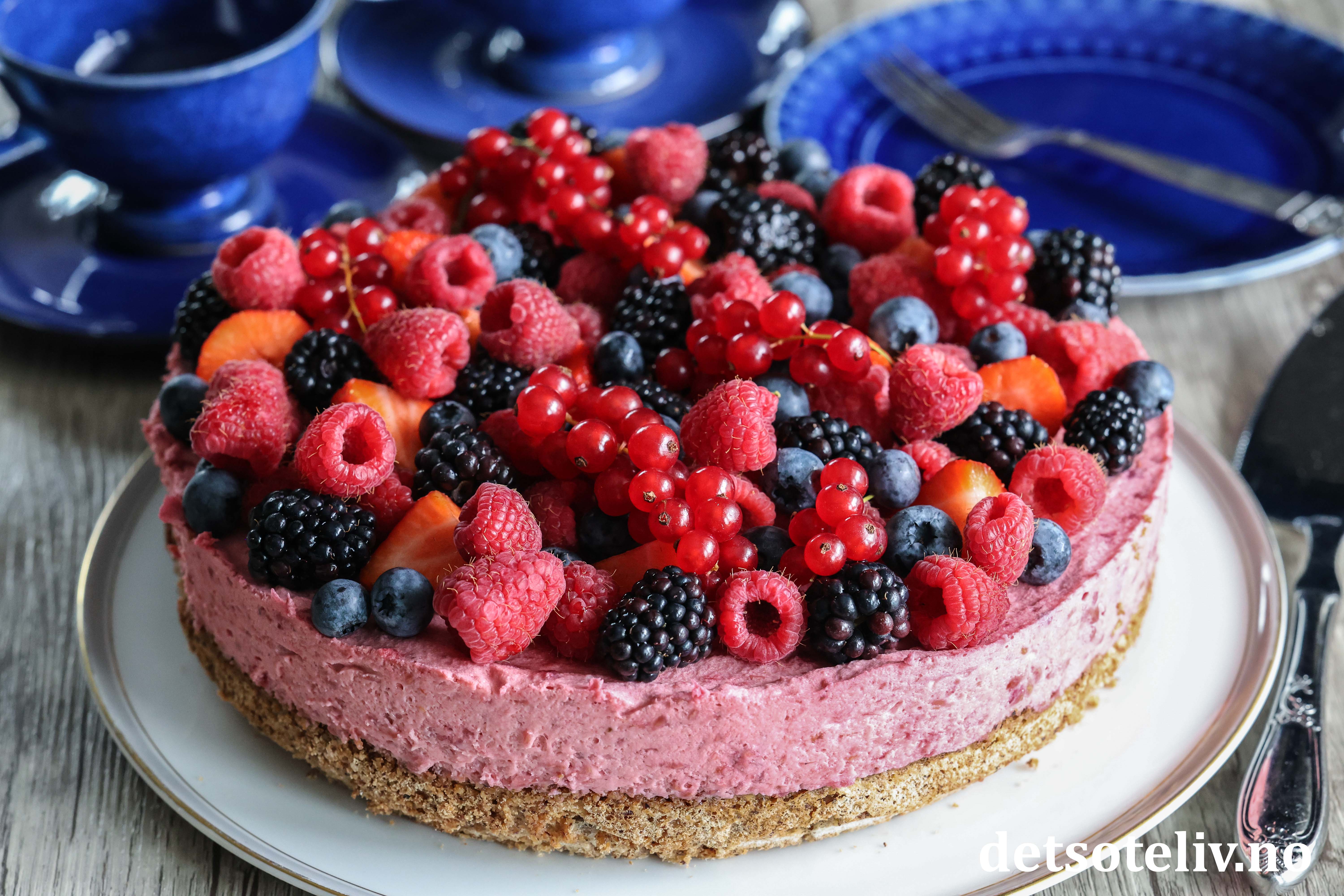 Før servering løsnes kakeringen fra kaken. Pynt kaken med masse friske bær.