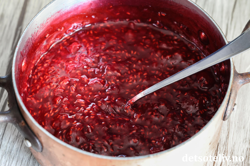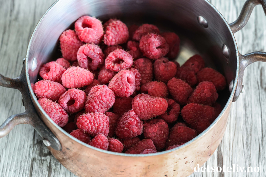 Ha bringebærene i en kjele (det går like fint med friske eller frosne bringebær).