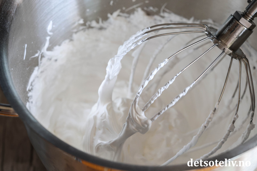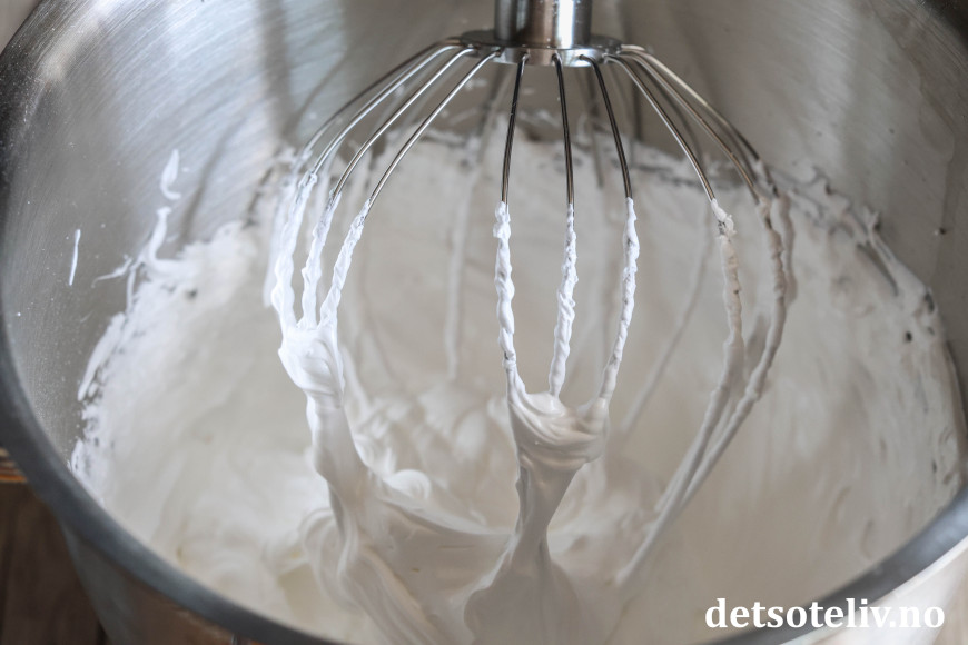 Pisk eggehvitene stive. Tilsett sukkeret, litt om gangen. Pisk videre til du får en tykk og stiv marengs.