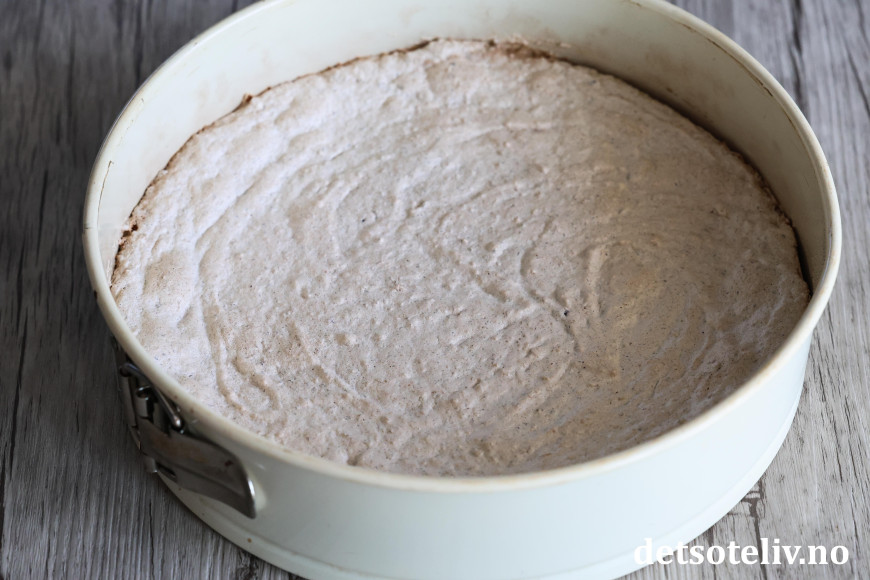 Ha nøttemarengsen i en rund form (26 cm i diameter) med bakepapir i bunnen. Jevn til overflaten.