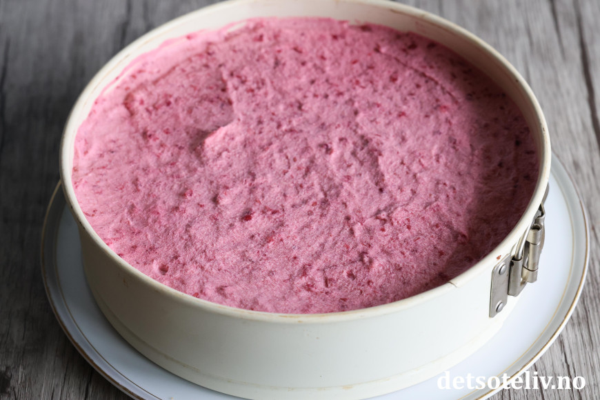 Bringebærmoussen får en søt og fin rosafarge, og med masse bær på toppen blir kaken både fresh og vakker.