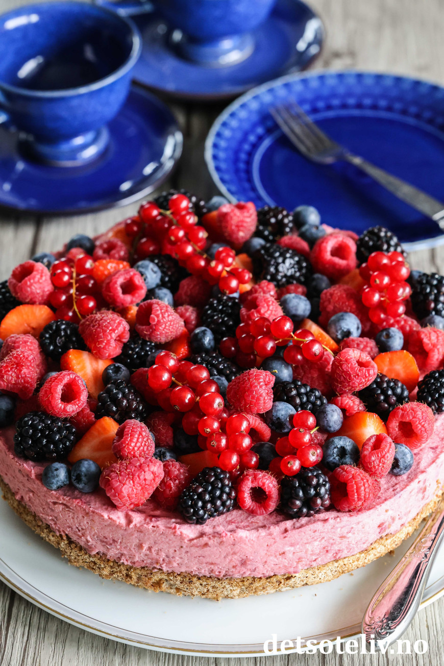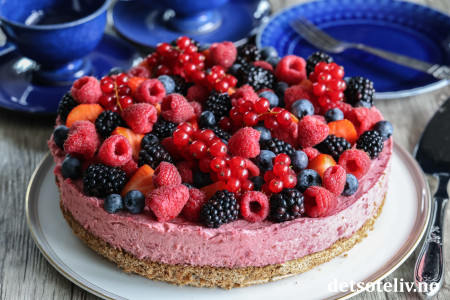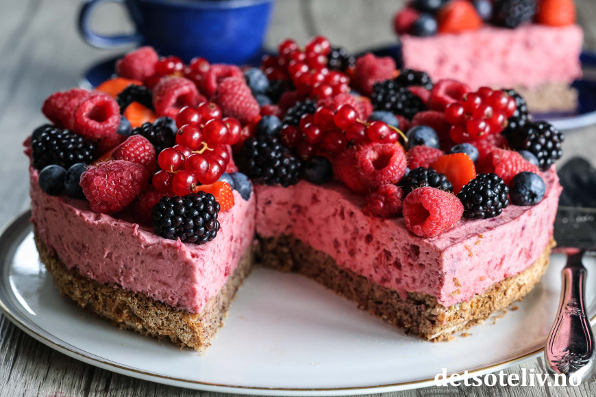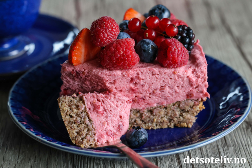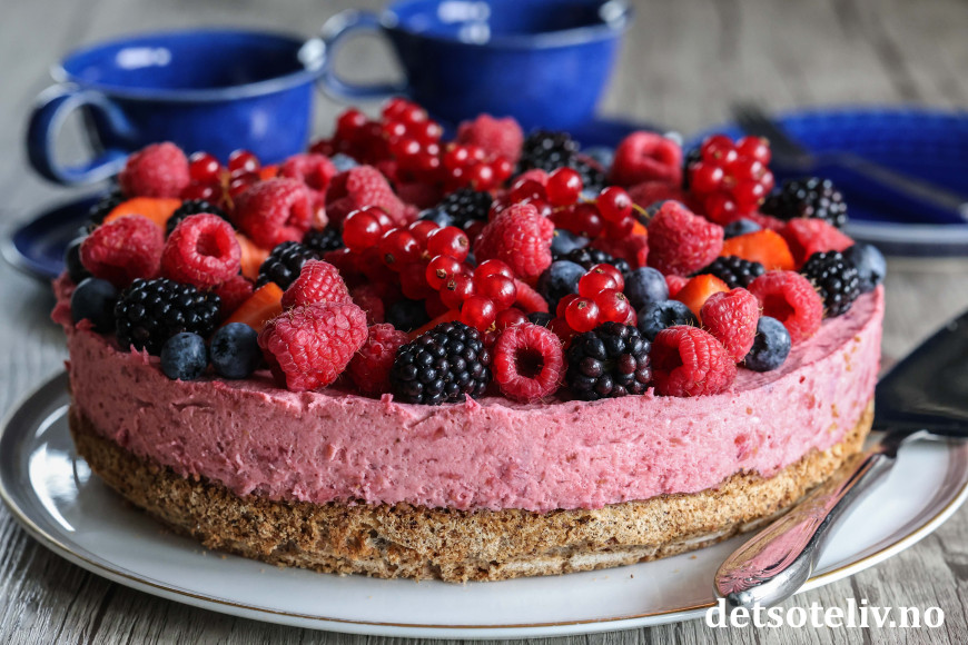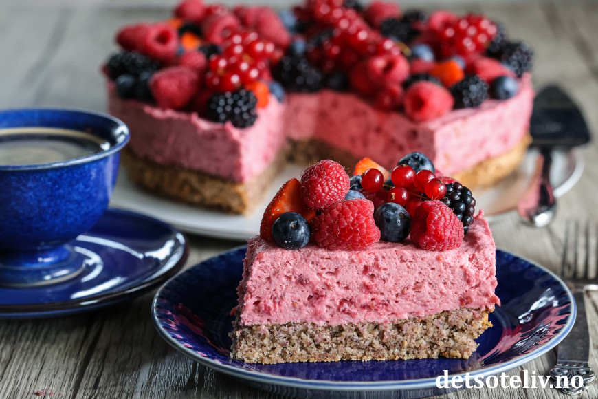 ♥ Det går fint å lage nøttebunn med bringebærmousse oppå klart dagen i forveien. Kaken bør pyntes med friske bær på serveringsdagen.