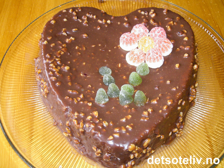 Hell deigen i en kakeform med hjertefasong som rommer 1,5 liter. Smør formen godt og klipp ut bakepapir til å ha i bunnen av formen (se tips dersom du heller vil lage en rund kake).