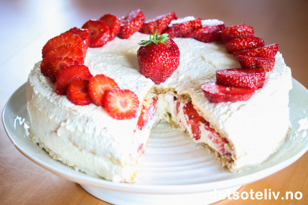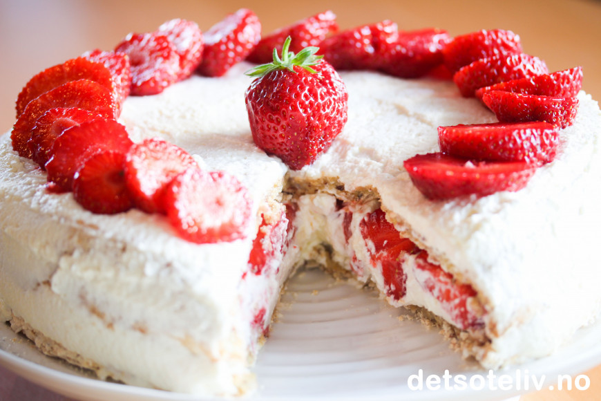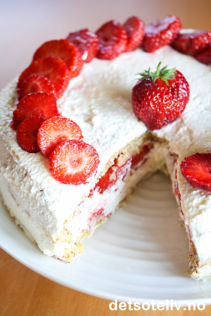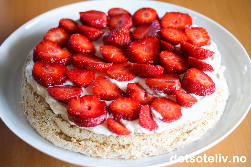Herlig sommerkake med smak av nøtter, vanilje og jordbær!