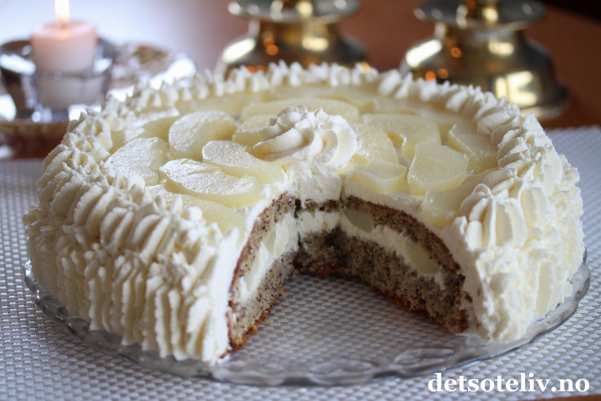 Min kjære bestemor, Signe, pleide å lage sin helt spesielle nøttekake (se oppskrift på Nøttekake) og servere den sammen med pisket krem og hermetisk frukt. Med dette som utgangspunkt lagde jeg en gang i forbindelse med et familieselskap den samme nøttekaken, men fylte den med krem og hermetiske pærer. Siden har "Nøttekake med pærer" blitt en skikkelig gjenganger i familien!