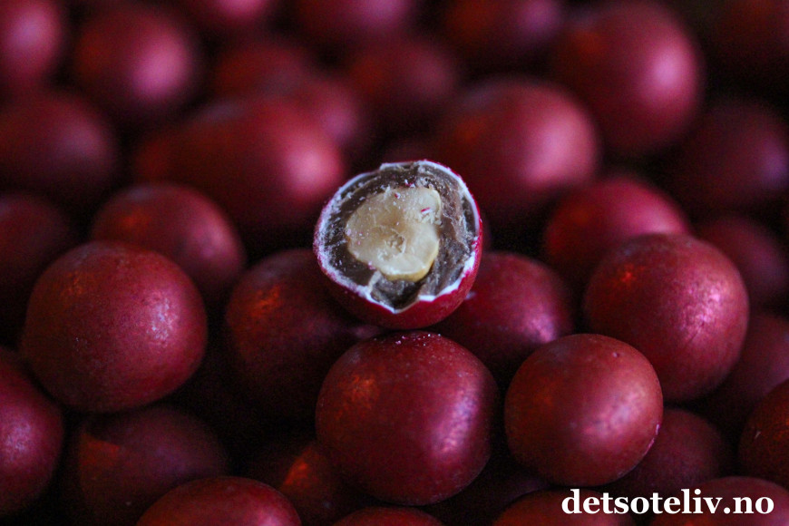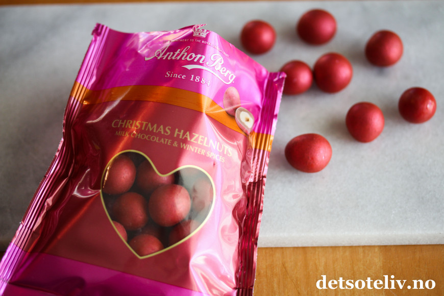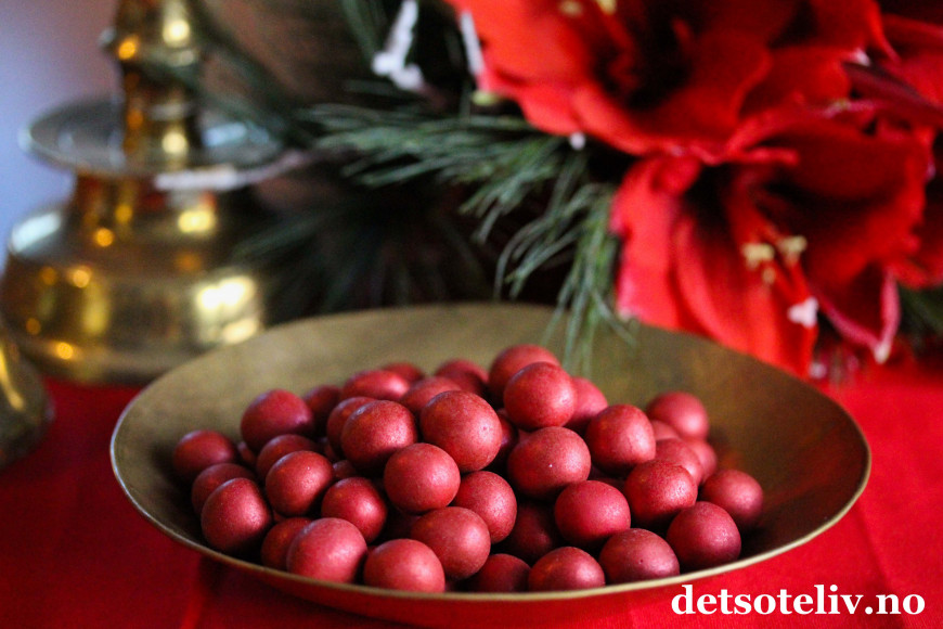 Disse "julehasselnøttene" er veldig dekorative, røde kuler med skimmer, som egner seg veldig fint som kakepynt i tillegg til at de er farlig gode!