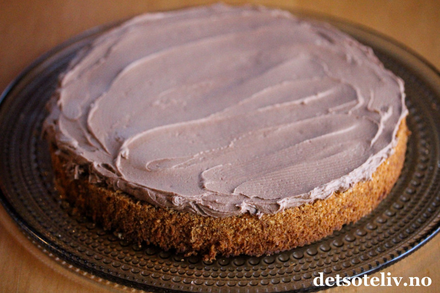 Fordel sjokoladekremen på den nederste kakebunnen.