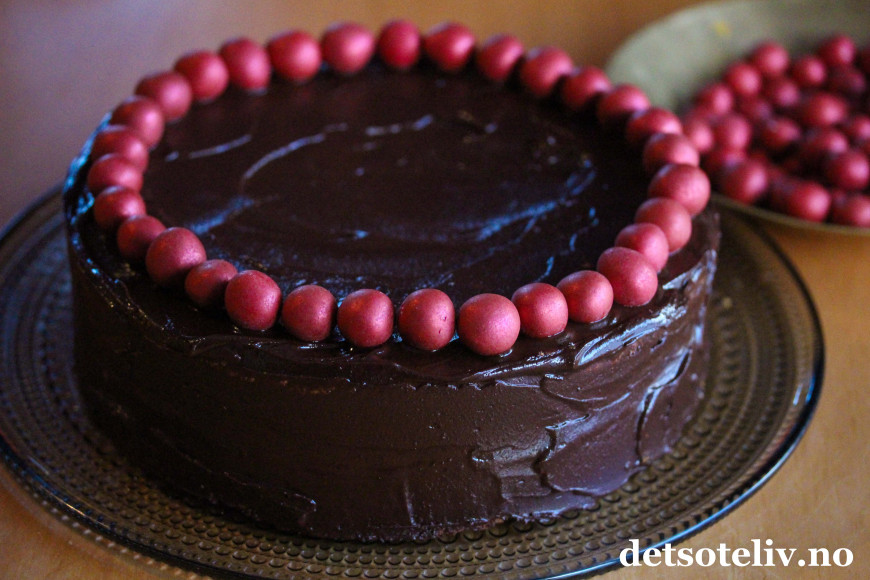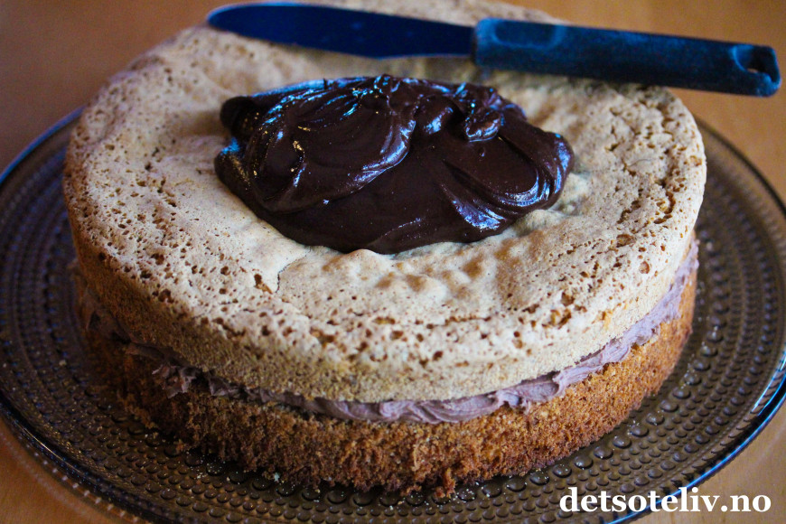 Sett kaken i kjøleskapet til sjokoladeglasuren stivner.