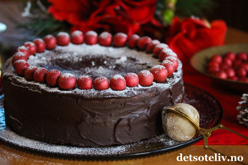 Fordel sjokoladeglasuren jevnt over hele kaken. Pynt kaken med vakre, røde julehasselnøtter.