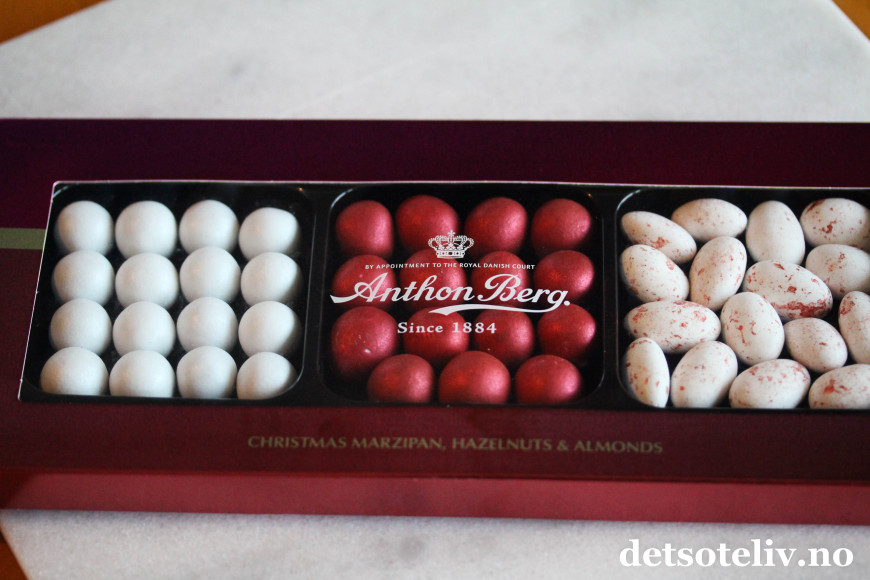 Disse julehasselnøttene er en av flere nye juleklassikere fra Anthon Berg. I tillegg til julehasselnøttene, har det kommet hvite julemarsipankuler og fine, dragerte julemandler i hvitt og rødt. Alle tre variantene ser du i denne lekre gaveesken.