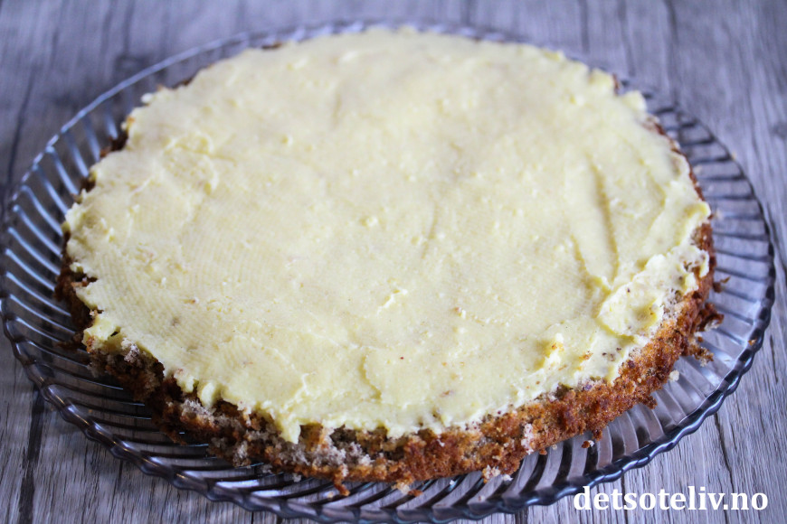 Løsne den kalde nøttekaken ut av formen og sett kaken på et kakefat. Del kaken i to bunner. Ta vaniljekremen ut av kjøleskapet og bre den over den nederste kakebunnen. Legg på den andre kakebunnen.