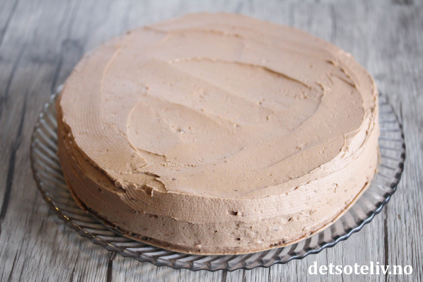 Bre et tykt lag sjokoladekrem over hele kaken (men spar litt sjokoladekrem til pynt).