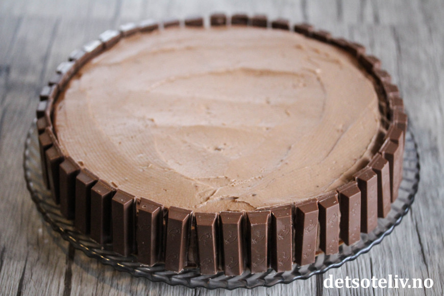 Først dekket jeg hele kanten på kaken med Kvikklunsj-stenger som jeg delte på midten.