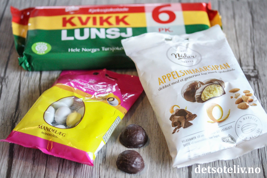 ♥ Som pynt på kaken brukte jeg Kvikklunsj fra Freia, mandelegg fra Anthon Berg og appelsinmarsipan fra Nidar (+ Kinderegg).