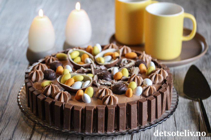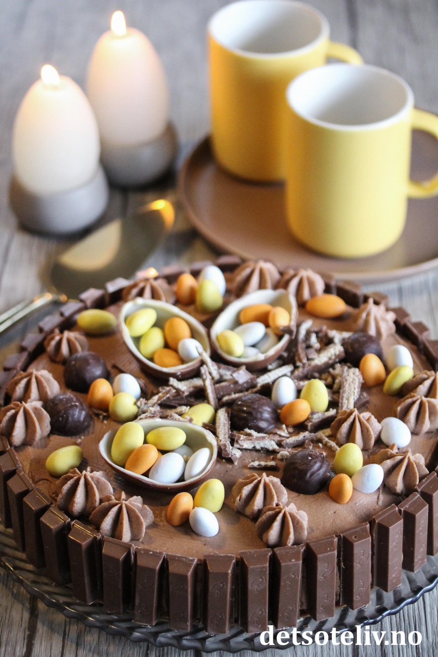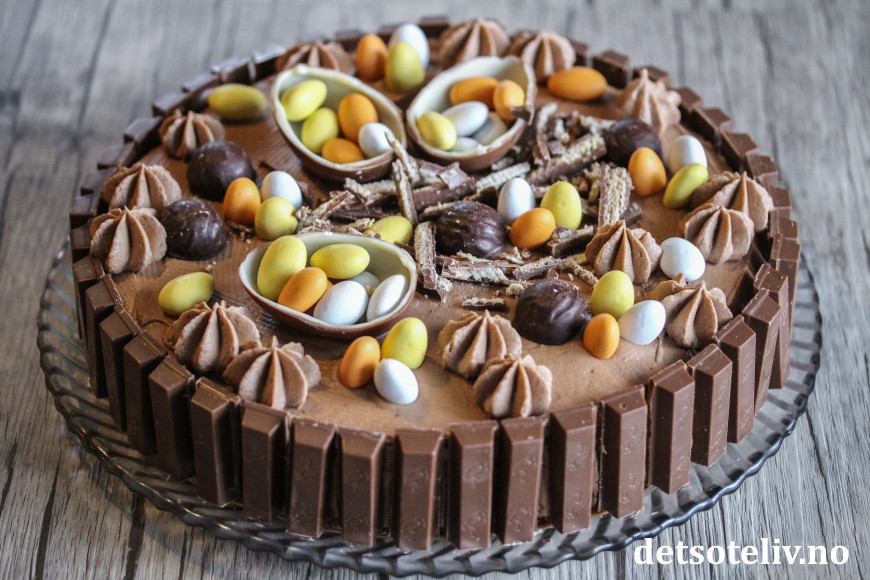 Kaken kan nå pyntes etter ønske. Siden jeg ville lage en påskekake, brukte jeg en kombinasjon av påskesjokoladene jeg liker aller best!