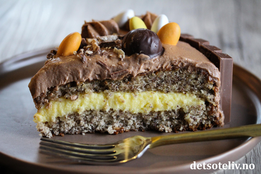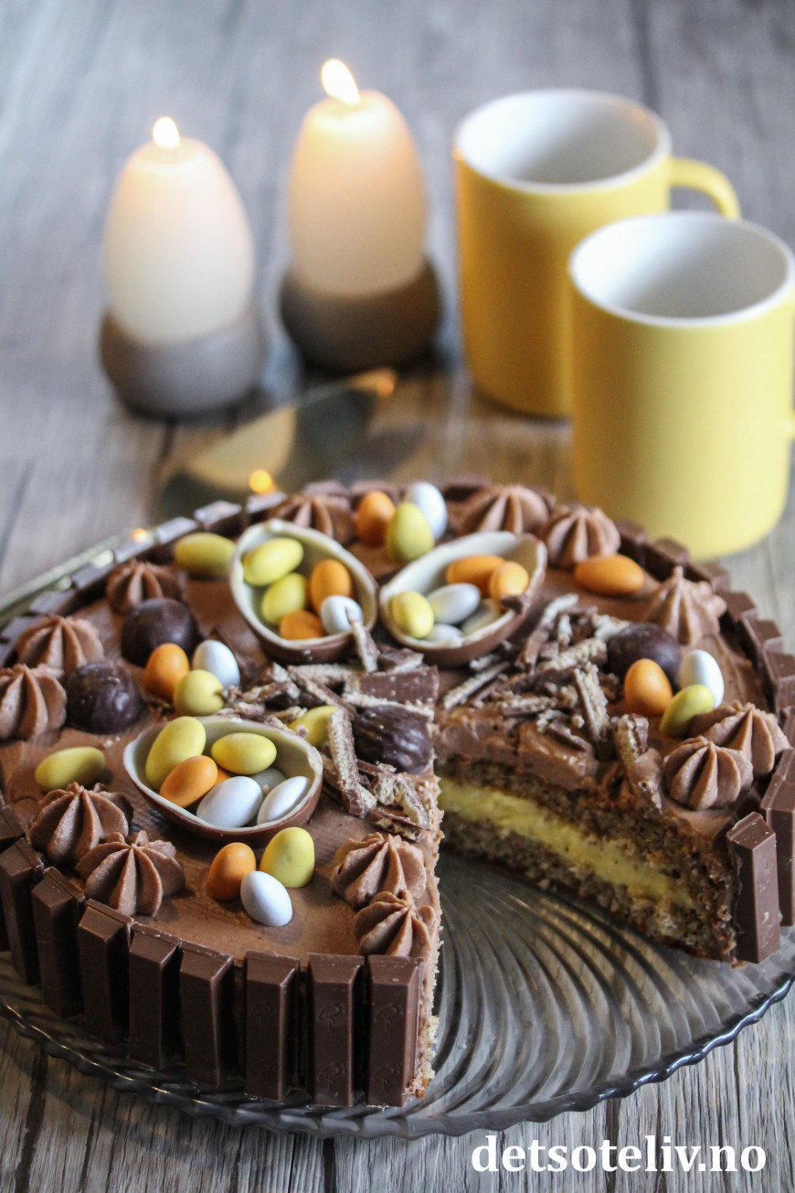 Nøttekaken passer til alle slags anledninger året rundt, men siden det er påske nå, har jeg pyntet dagens kake med Kvikklunsj, Kinderegg, påskemarsipan og mandelegg.