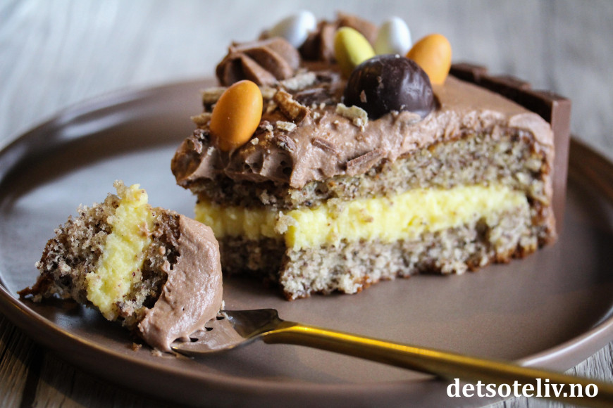 Start gjerne kvelden i forveien med både nøttekaken, vaniljekremen og sjokoladekremen.