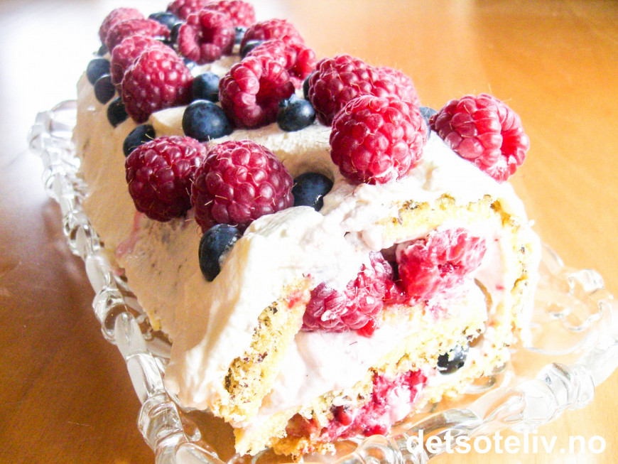 Pisk kremfløten til fyllet. Hold av 1/3 til pynt. Bland resten av kremen med jordbærsyltetøy. Bre jordbærkremen over den kalde nøttebunnen (se tips). Fordel over bringebær og blåbær. Rull kaken sammen fra langsiden. Skjær til kantene og legg rullekaken på et passende fat.