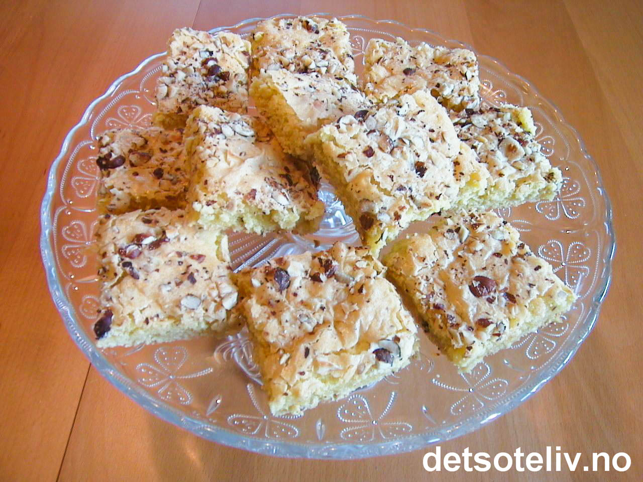 Ha bakepapir i bunnen på en stor langpanne (ca 30x40 cm). Smør bakepapiret med litt smør. Hakk hasselnøttene og dryss halvparten over bakepapiret i langpannen. Ha deretter deigen i langpannen og bre den utover i et tynt og jevnt lag (bruk en smørekniv). Dryss resten av hasselnøttene over deigen.