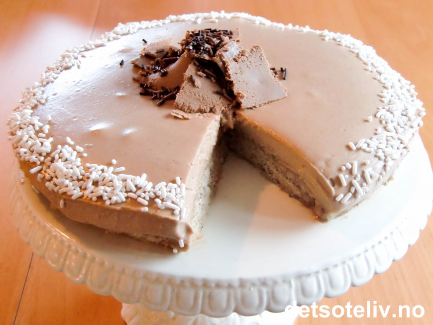 Ha nougatkremen over den kalde kaken i formen og sett den deretter i kjøleskapet i et par timer, og gjerne over natten, så nougatkremen stivner i konsistensen.