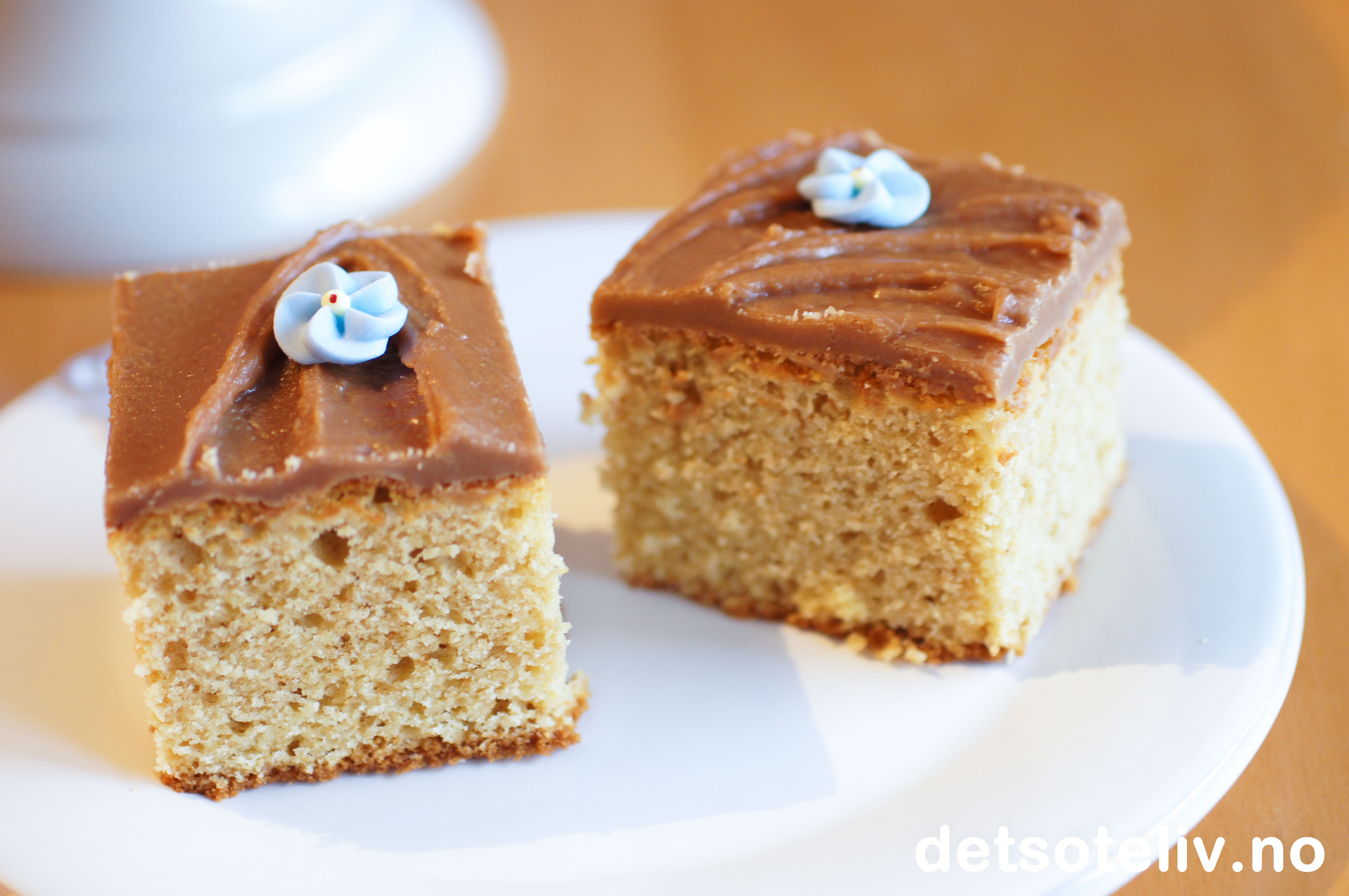 Bre glasuren over den avkjølte kaken med en smørekniv. Del kaken opp i passe store firkanter.
