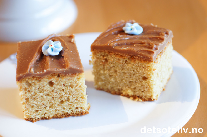 Ha deigen i en stor, bakepapirkledd langpanne (ca 30x40 cm). Stek kaken midt i ovnen ved 180°C i 35-40 min (se tips). Avkjøl kaken i formen. Hvelv den ut av langpannen og fjern bakepapiret.