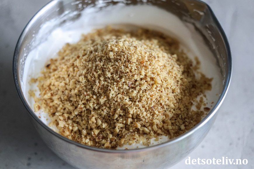 Vend de hakkede valnøttene forsiktig inn i marengsen.