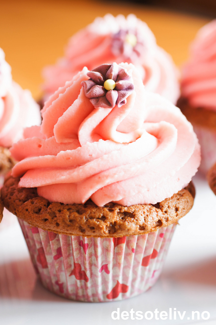 Ha jordbærkremen i en sprøytepose med stor sprøytetut og sprøyt vakre topper med jordbærkrem på hver cupcake.