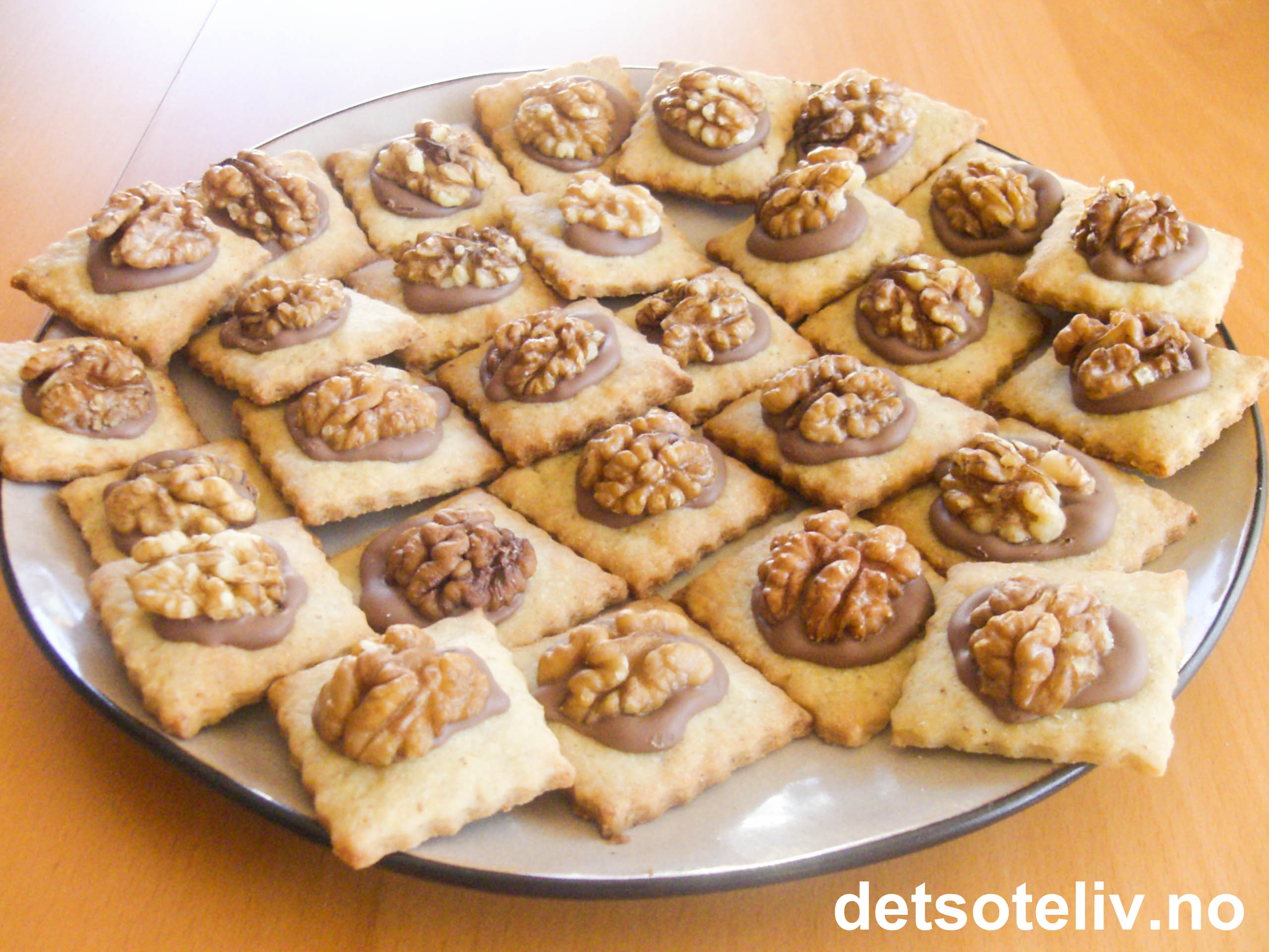 Pynt hver kake med en liten klatt smeltet melkesjokolade og en valnøttkjerne. Sett kakene i kjøleskapet til sjokoladen har stivnet. Oppbevar kakene kjølig i tettsluttet kakeboks.