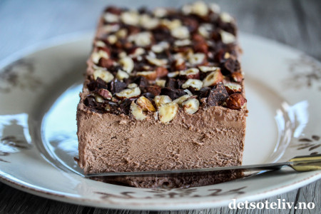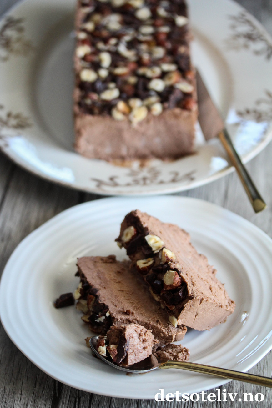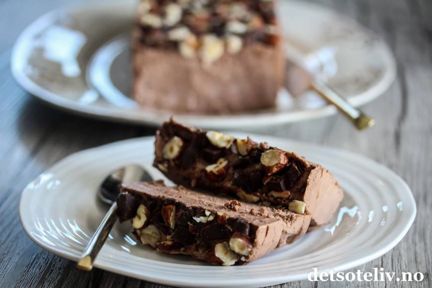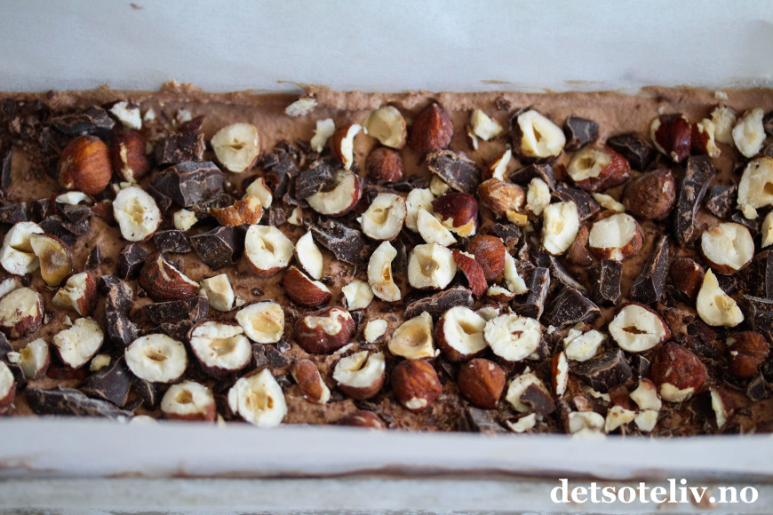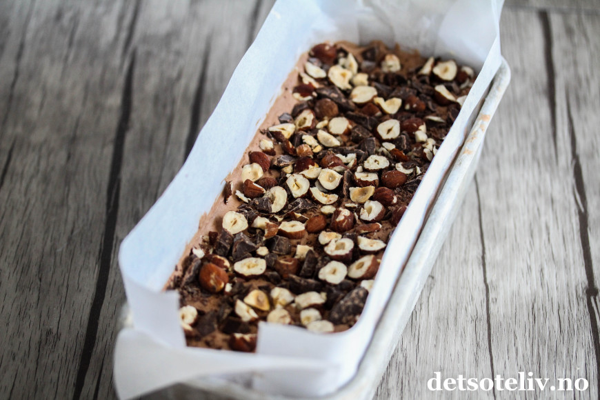 Kle en liten brødform (1 liter) med bakepapir (både bunn og kanter). Hell iskremblandingen i formen. Dryss over grovt hakket sjokolade og hasselnøtter.