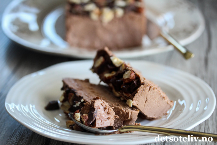 Dryss over grovt hakket sjokolade og hasselnøtter.