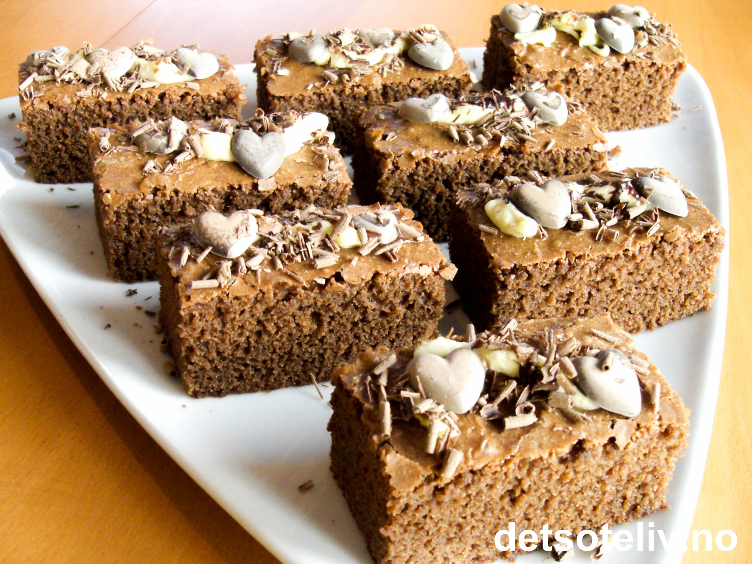 Hvelv kaken forsiktig ut av formen og fjern bakepapiret. Del kaken opp i passe store serveringsstykker. Pynt med smeltet hvit sjokolade, sjokoladehjerter og høvlet sjokolade eller bare sikt over litt melis.