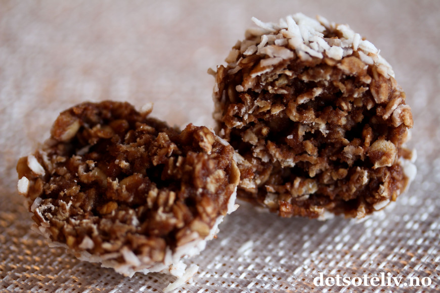 ♥ Når du skal forme kulene med hendene kan det være lurt å fukte hendene med vann jevnlig for at havregrynsmassen ikke skal klistre seg for mye til fingrene.