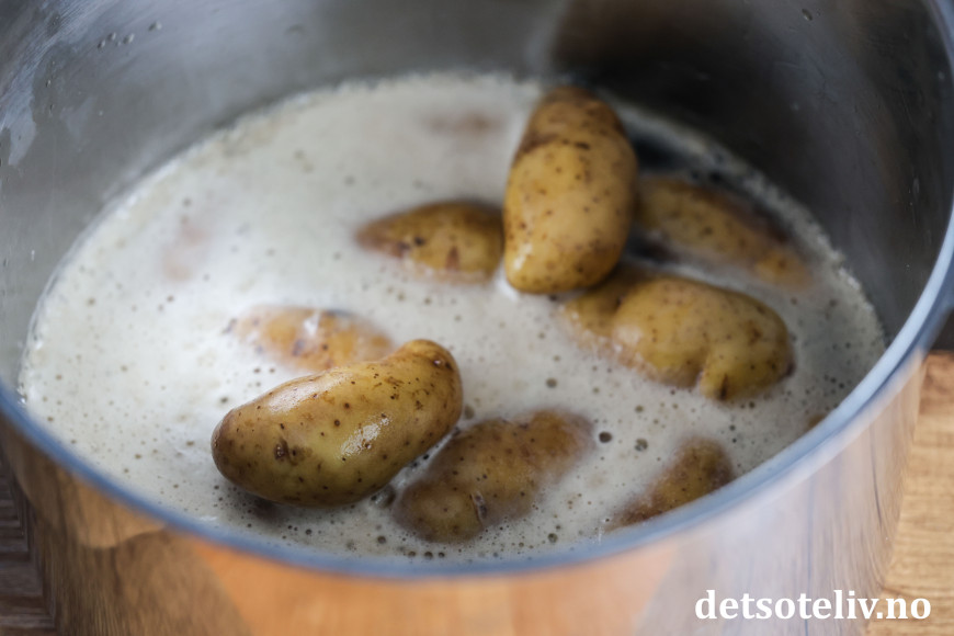 Finn frem en stor og vid kjele (den jeg brukte her rommer 15 liter). Legg vaskede, hele, rå og uskrelte mandelpoteter tett i tett i bunnen av kjelen slik at bunnen blir dekket.