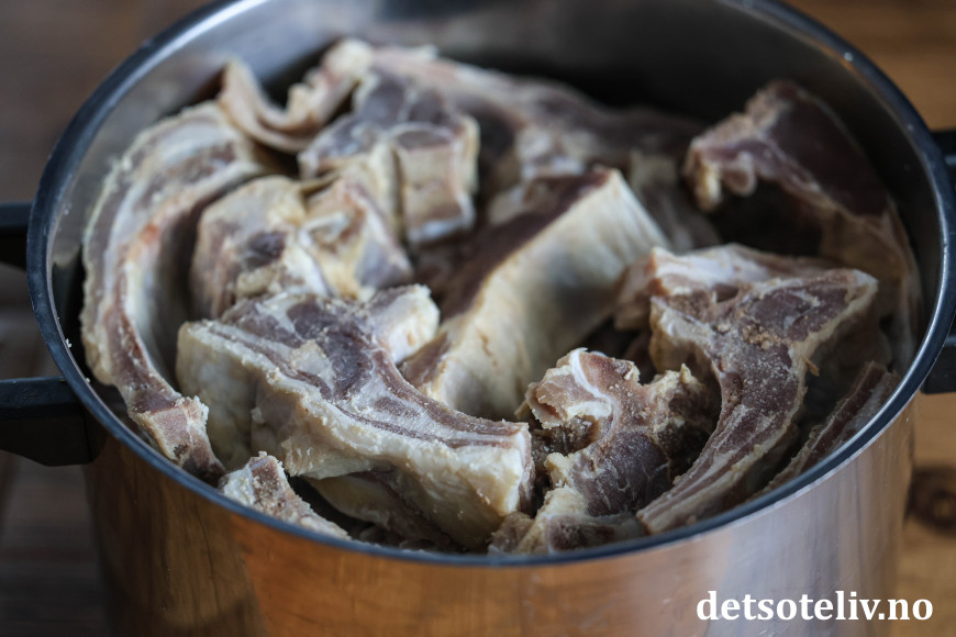 Start tidlig med å legge pinnekjøttet i en stor kjele og helle over kaldt vann til pinnekjøttet er helt dekket.