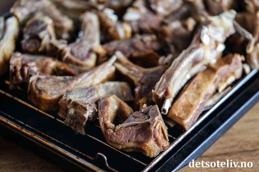Stek pinnekjøttet midt i ovnen ved 240°C i 5 - 10 minutter (følg nøye med så pinnekjøttet ikke blir tørt).