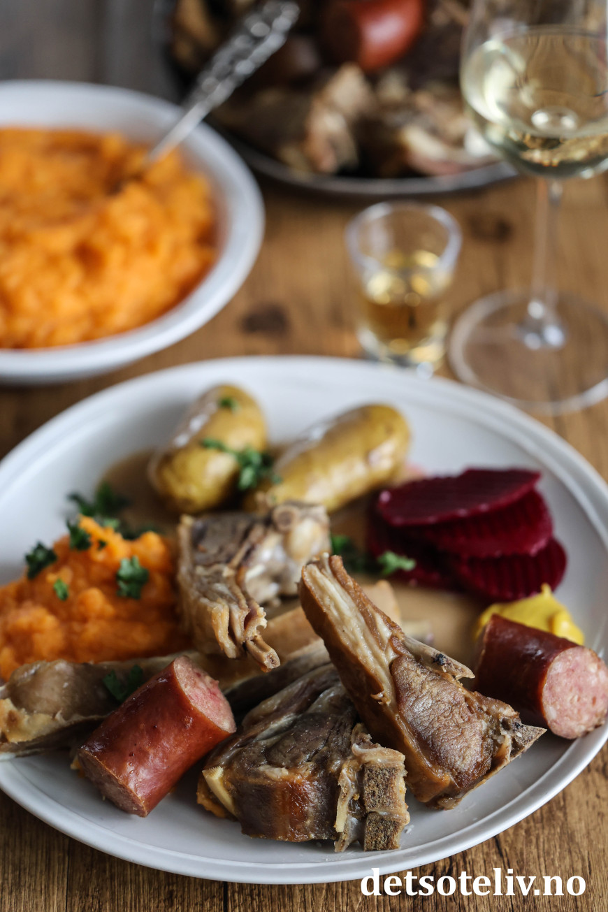 Mens kjøttet koker, lager du i stand kålrot- og søtpotetstappe (se oppskrift og beskrivelse i eget innlegg).