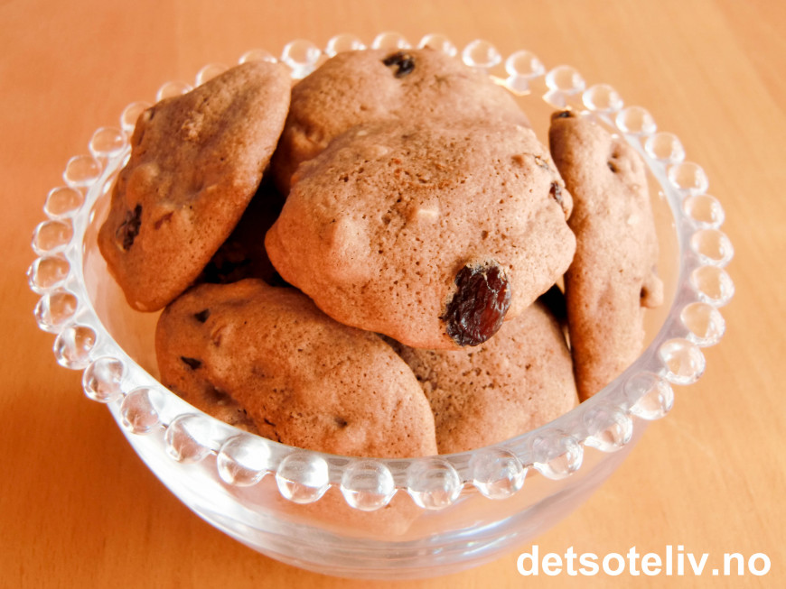 Sett små topper på bakepapirdekkede stekeplater. Beregn litt avstand, for kakene flyter utover under stekingen. Stekes ved 225°C i 10-15 min. Avkjøles på rist.