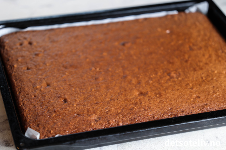 Ha deigen i en stor, bakepapirkledd langpanne (ca. 30 x 40 cm). Stek kaken midt i ovnen ved 175°C i ca. 40 minutter, eller til kaken er gjennomstekt.
