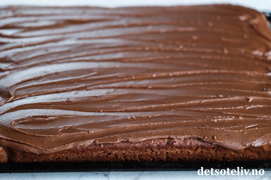 Smør sjokoladekremen over kaken i et tykt, jevnt lag.