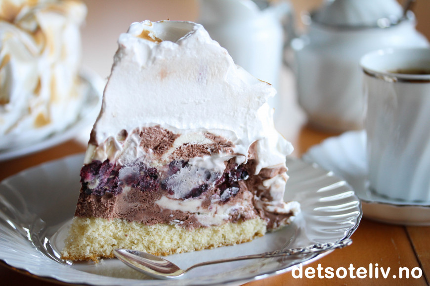 ♥ Jeg brukte en kombinasjon sjokolade og vaniljeis og bjørnebær, men hvilken som helst kombinasjon av iskrem og bær kan sløyfes. Poenget med kaken er is i kombinasjon med det tykke laget marengs.