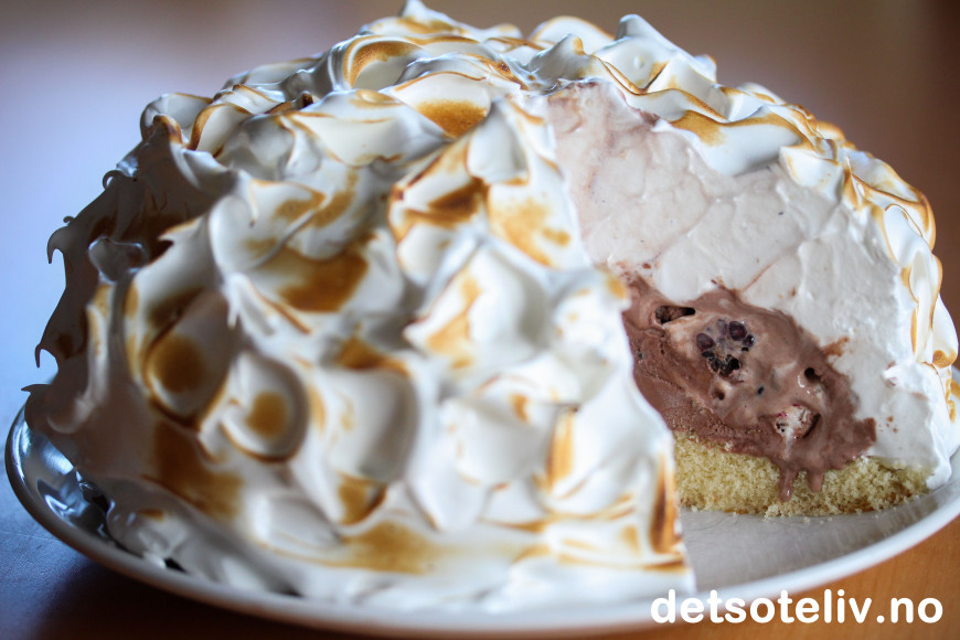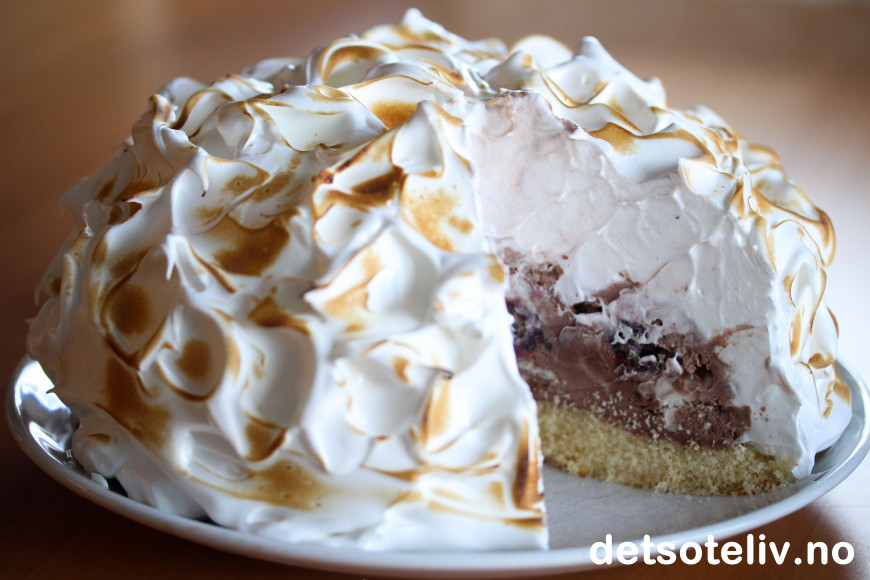 Franskmennene som har kalt denne berømte desserten for "norsk omelett" synes antakelig den minner om norske breer og isfjell. Jeg har imidlertid blitt tipset om at en "Omelette norvégienne" opprinnelig har en oval form lignende bunnen av et norsk vikingskip, og at dette begrunner navnet. Jeg har likevel laget kaken rund her, og det har også blitt mer og mer vanlig.