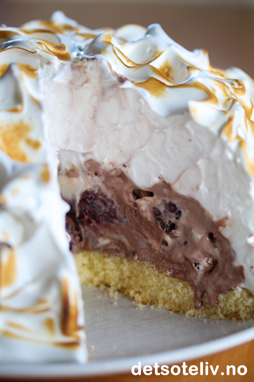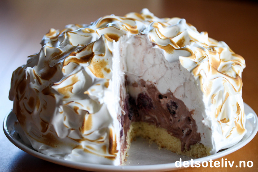 Kaken er veldig enkel å lage: Man tar en sukkerbrødbunn som man dekker med bær og iskrem. Så pisker man tykk marengs og fordeler over hele kaken før servering. En runde med gassbrenneren gjør at marengsen blitt lett grillet og ser ekstra stilig ut!
