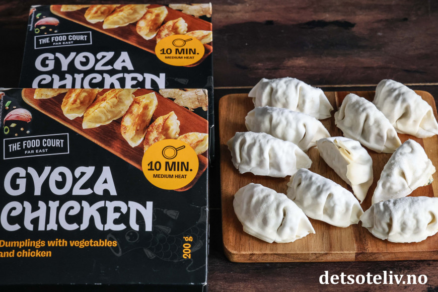 ♥ Gyoza fås kjøpt med ulike type fyll. Jeg brukte her gyoza med kyllingfyll, men andre varianter går like fint å bruke. Tilberedes i frossen tilstand.