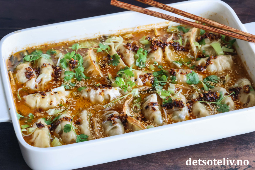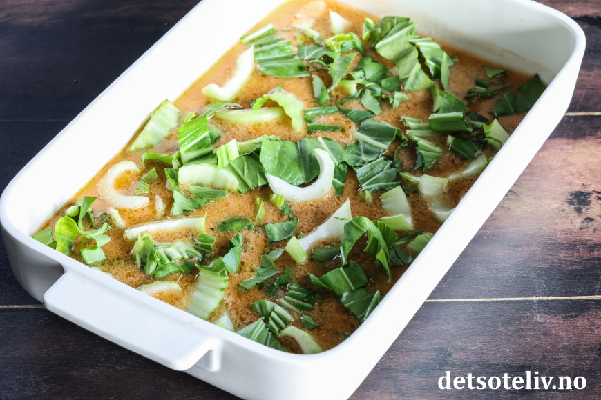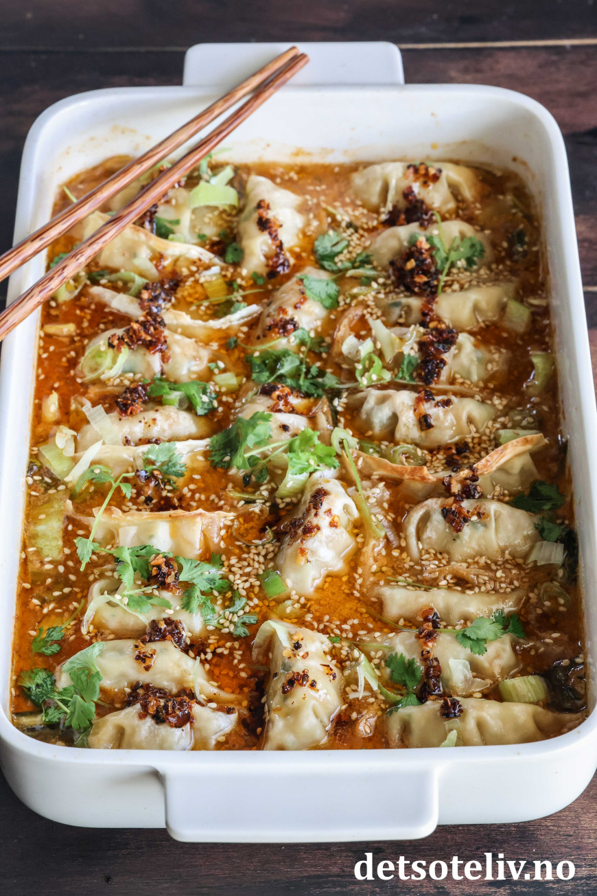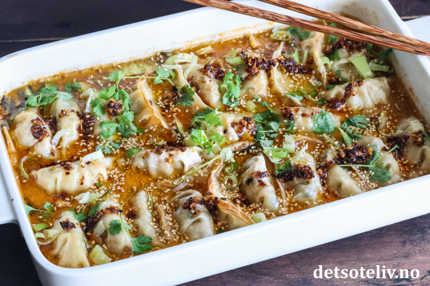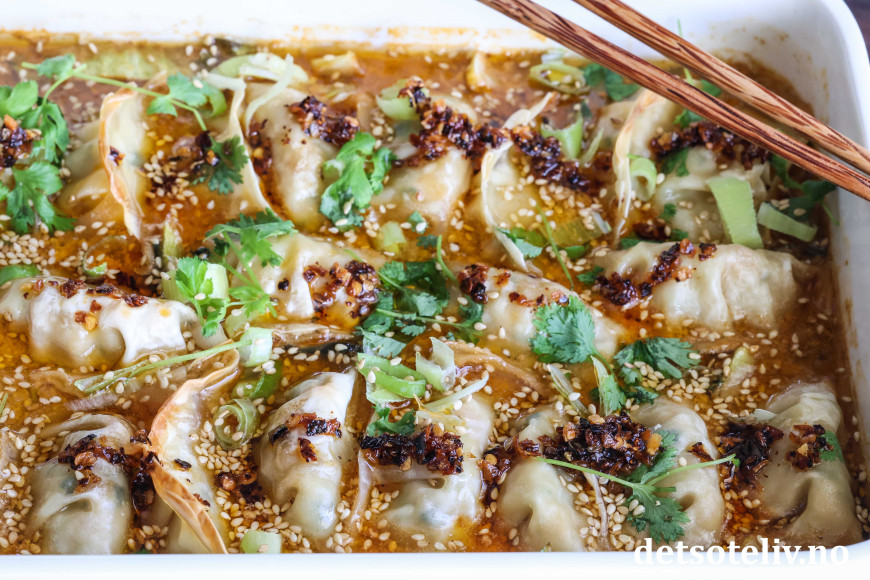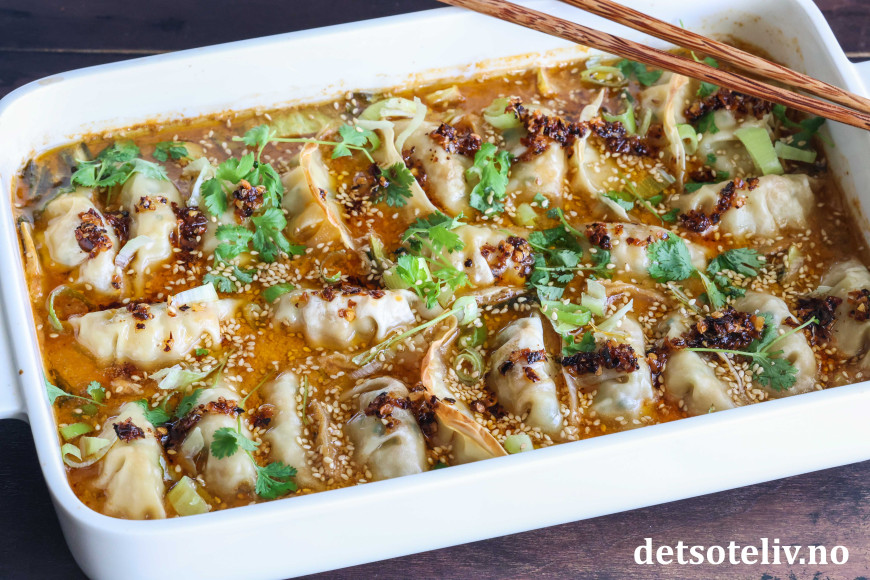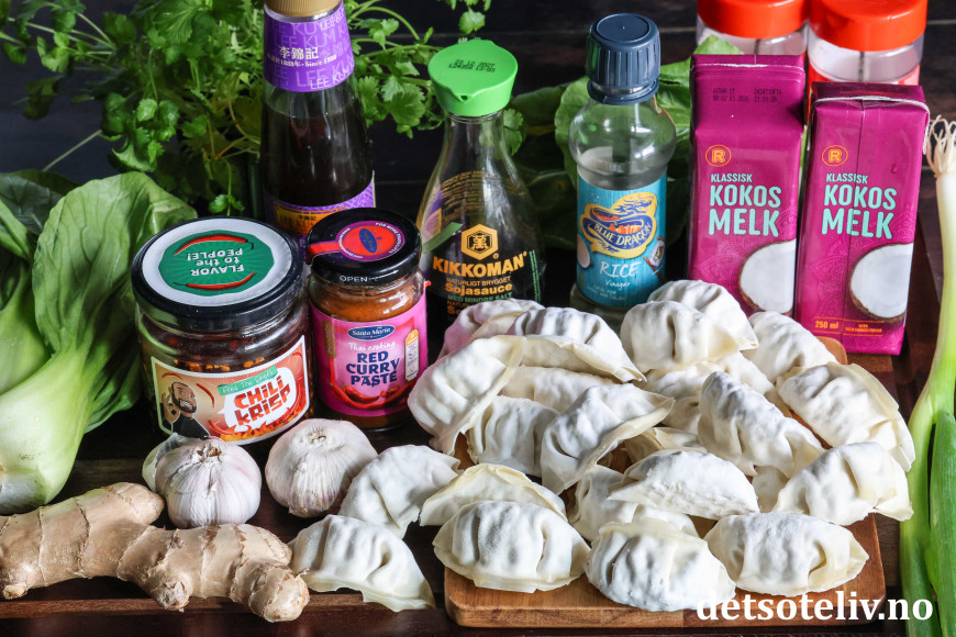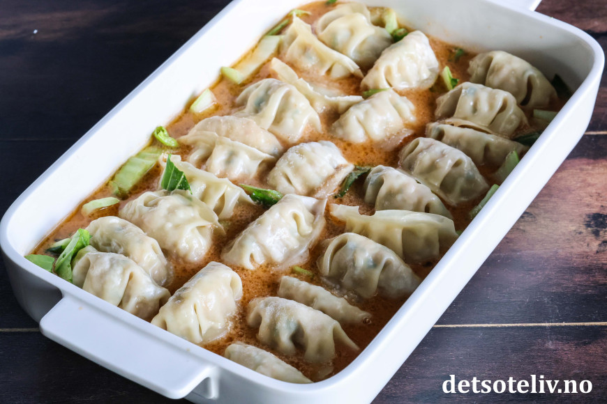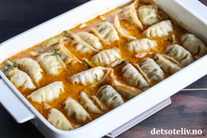 Gyoza er japanske dumplings, som vanligvis stekes for å få stekeskorpe og deretter dampes. Her ovnsbakes gyoza i stedet i en nydelig, kremet currysaus. Sausen består av kokosmelk, rød curry paste, hvitløk, ingefær, soyasaus, riseddik og sesamolje. For å få litt grønt, has også oppkuttet pak choy i formen.